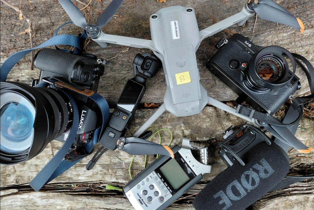 Un appareil photo plein format photo et vidéo avec une optique courte pour être proche. Un Osmo pocket 3 qui fait tout ou presque, un drone pour prendre de la hauteur, un boitier argentique pour le fun, un micro, et un enregistreur. J’ai oublié, un pied et un filtre gris neutre…